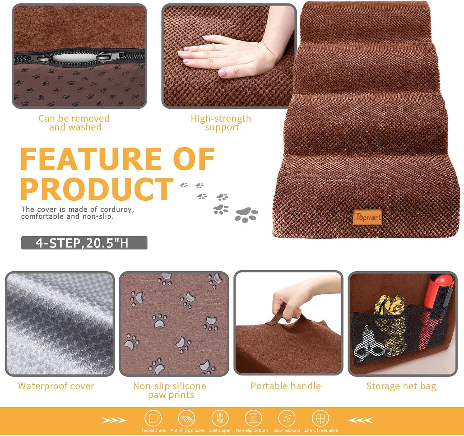 - Safer,Wider&Deeper Steps:Each step is 15.75in x 7.1in.Our dog stairs are excellent for those older dogs who are less mobile as they age or for cats with injuries. More wide and deep steps are helpful for reducing the strain that constantly jumping up and down onto bed,sofa or car can have on your pet's joints,and Topmart dog steps will not shake and slip during use. The cover made of corduroy is more frictional than other covers, pets will not slip on the stairs.