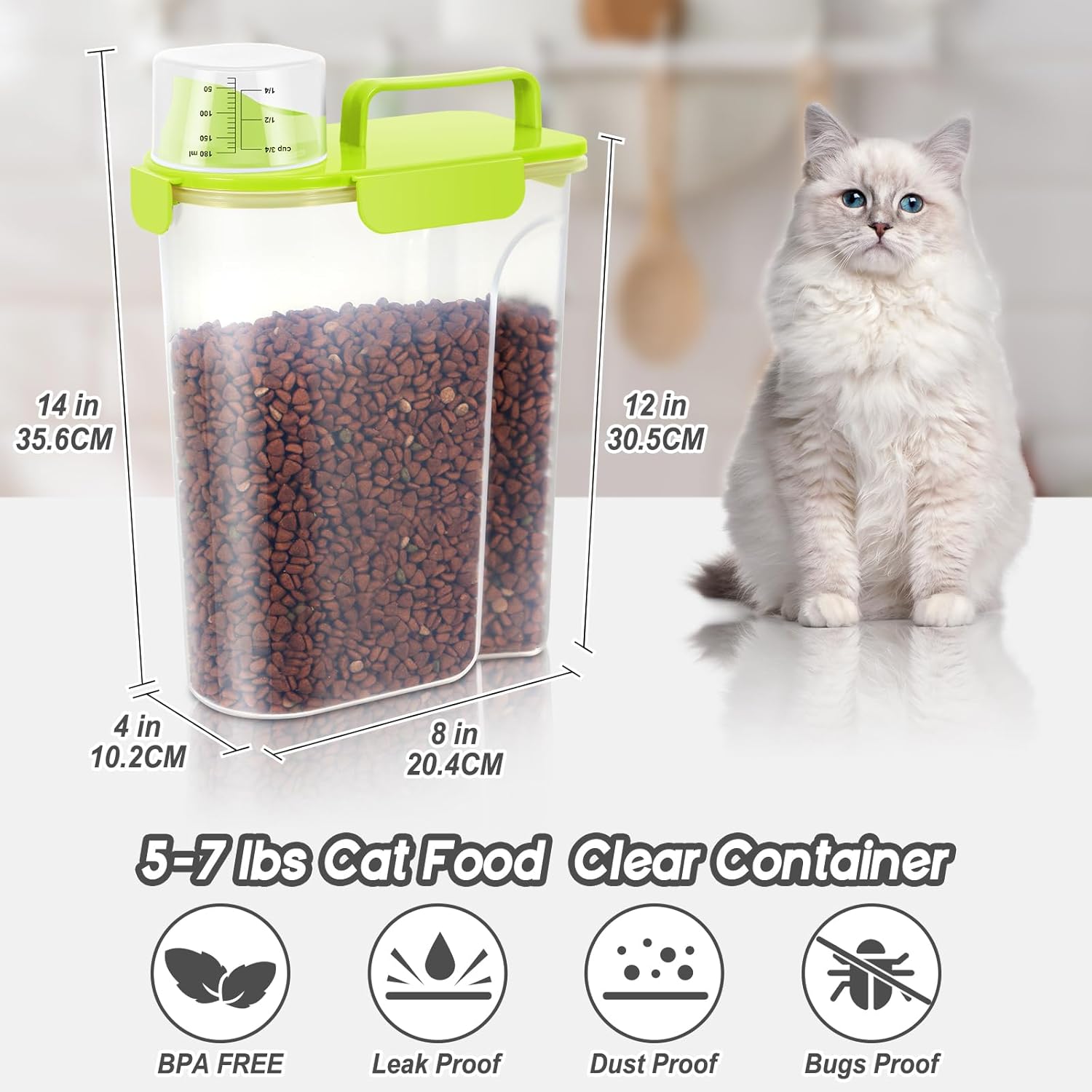 - SUPER LARGE CAPACITY: The airtight cat food Storage container is designed with a large nozzle, so whether it is small or large pieces of food, it can be easily poured out without shaking the barrel. The handle design makes it easy to use and carry indoors and outdoors. It is also convenient to hold with one hand and tip the bucket to pour out food. The size of the pet food container is 14*12*8 inches, with a capacity of 5 liters. It can store pet food for 5 -7LBS, rice, dry food, cereals, etc. is about 10LBS, depending on the size and shape of the food. Can be easily stored and effectively save valuable space whether indoors, outdoors or during travel.