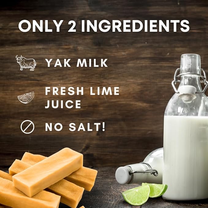 - Simple, Natural 2 Ingredients: Our yak cheese Himalayan dog chews contain only two ingredients—yak cow milk and lime juice—providing a pure, healthy treat for your dog that's free from additives, gluten, and chemicals. Ideal for dogs with sensitive stomachs.