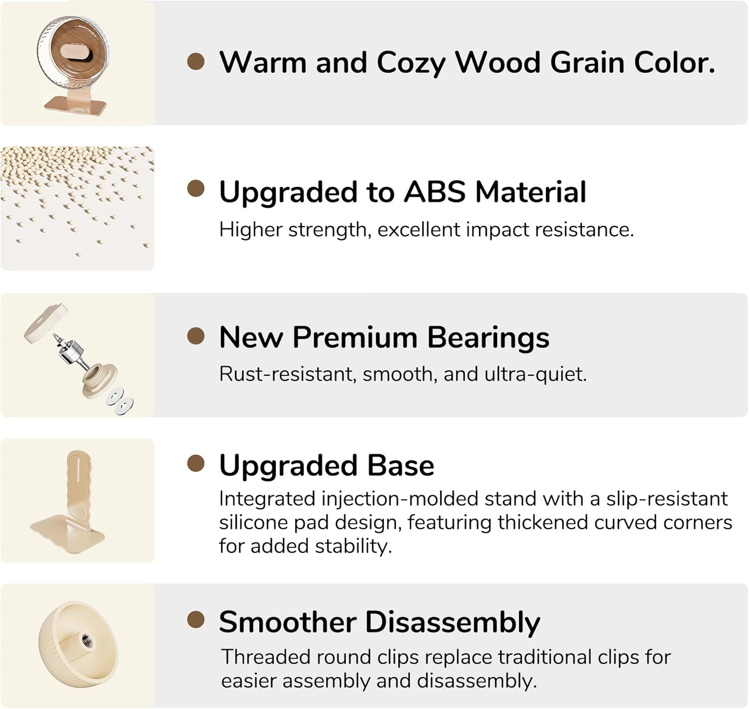 - New Premium Bearings: Our exercise wheel features high-precision bearings that ensure smooth, quiet, and durable performance. These advanced bearings help reduce noise and enhance the wheel's stability, providing a better exercise experience for your pet