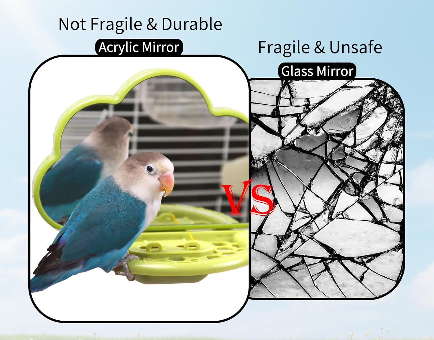 - Safe & Durable Design with Protective Edging: Unlike fragile glass, this acrylic mirror has rounded safe edges to prevent scratches. Durable and bird-friendly, giving your feathered friend a safe toy they can interact with every day.