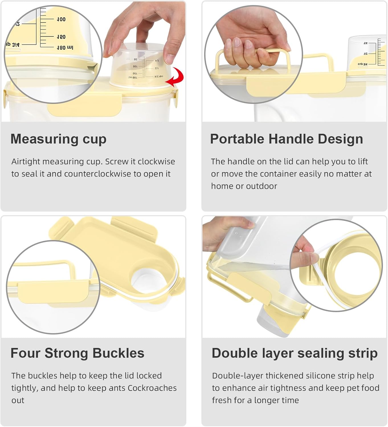 - WHAT YOU GET?:The small dog food bin comes with a 1-pack airtight pet food storage container with a clear measuring cup and an upgraded large spout for easy pouring of pet food at any time. This dog food storage containers can be a gift The perfect gift for any home.