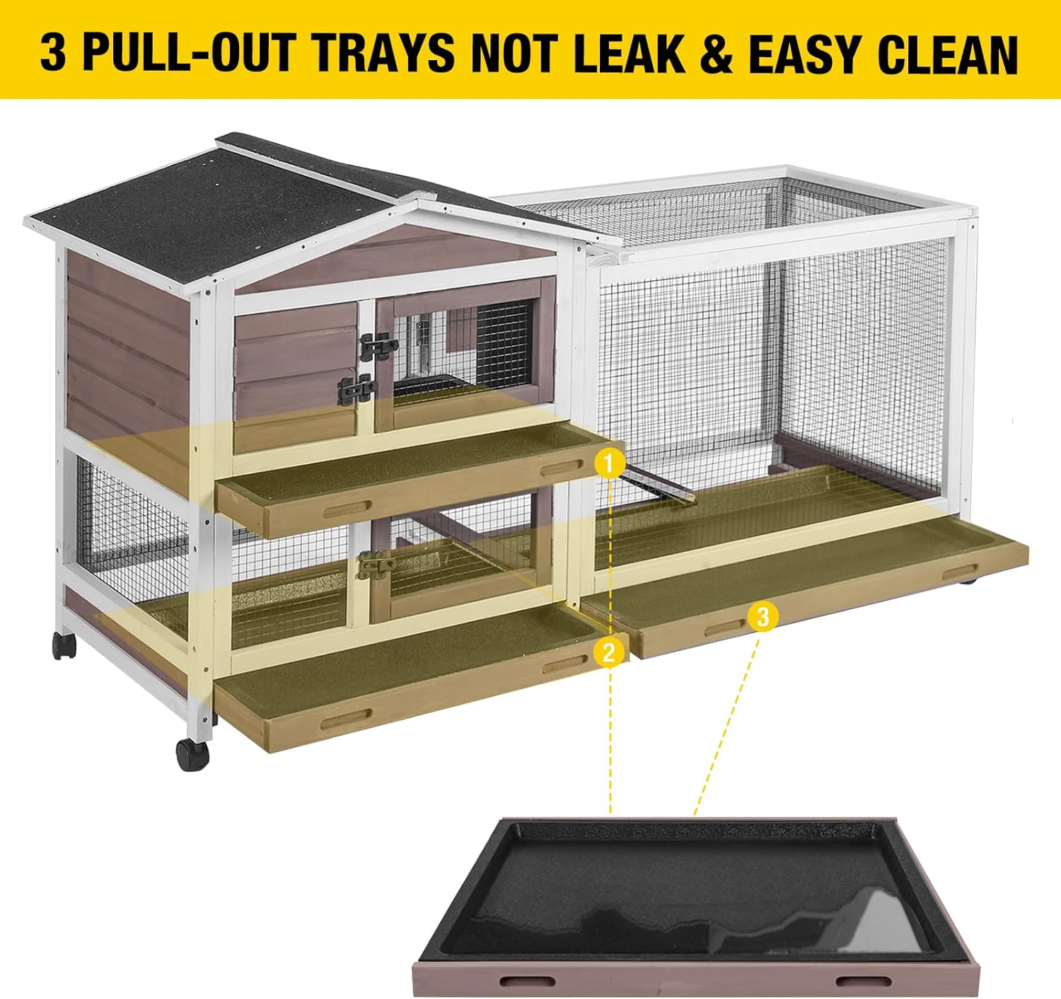 - 【Leakproof Tray】The rabbit cage comes with 3 pull-out tray,the tray is made of high quality plastic,anti-odour and easy to clean,sturdy and durable,the tray will not leak or rust!The trays can be pulled out from the front or back.