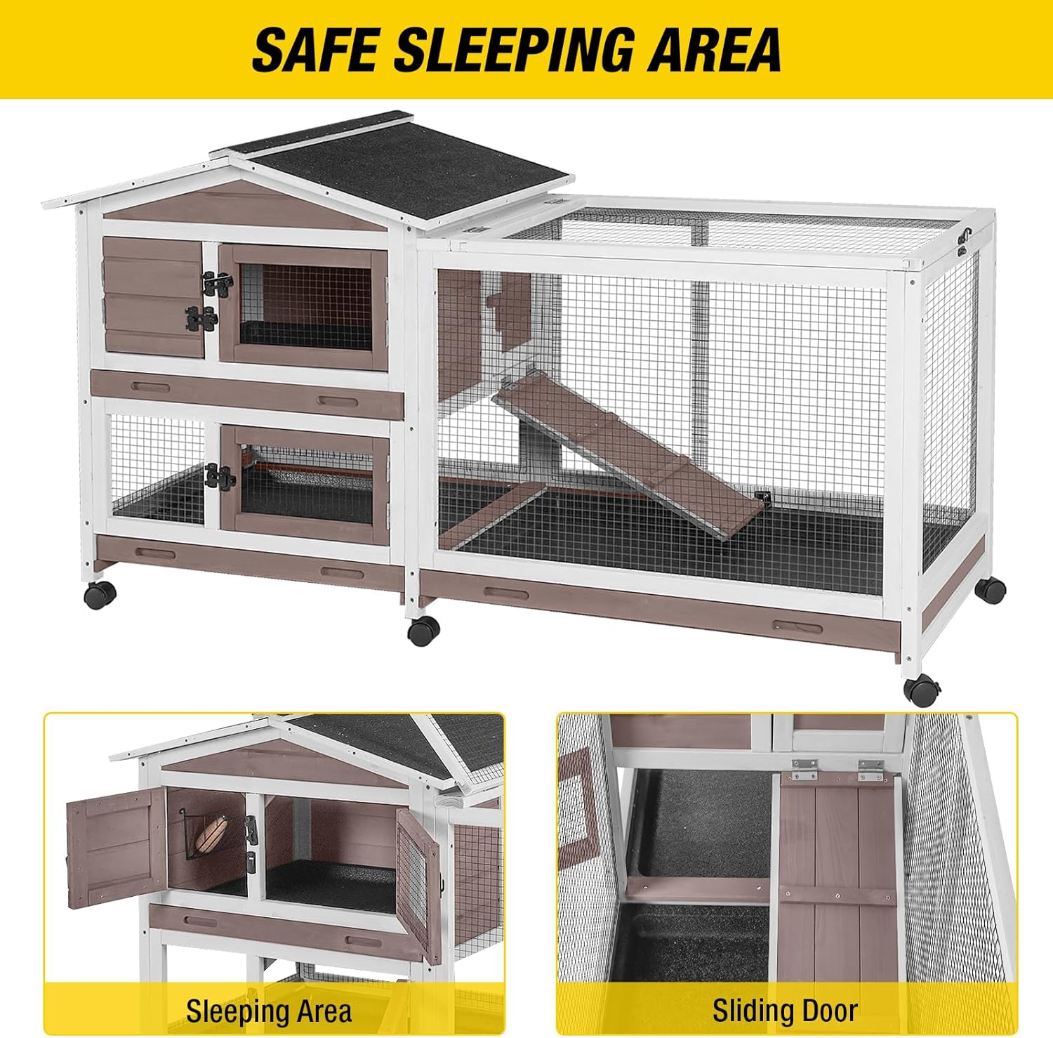 - 【Water Resistant Asphalt Roof】This rabbit hutch features a durable asphalt waterproof roof to protect your furry pet from the elements, and predator-resistant spring latch keeps your poultry safe.