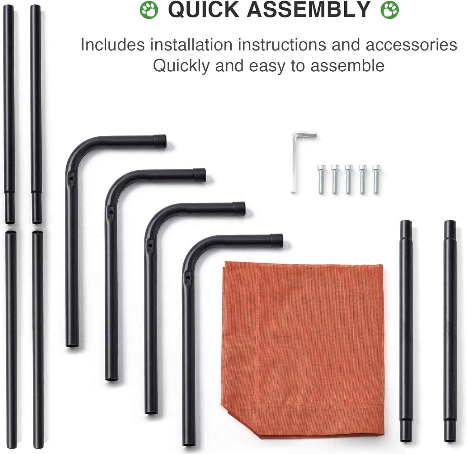 - EASY TO ASSEMBLE: Easy to assemble and disassemble for transport, including: 1 mesh, 4 legs, 2 leg extension rods, 4 cross support extension rods, 4 screws (WON’T rust) and 1 hex key. Off-the-ground design is perfect for both indoors and outdoors, you can place a dog pad on top of the mesh like a mattress to make it softer in your living room, also it is convenient for traveling, camping, hiking, fishing, BBQ, etc .