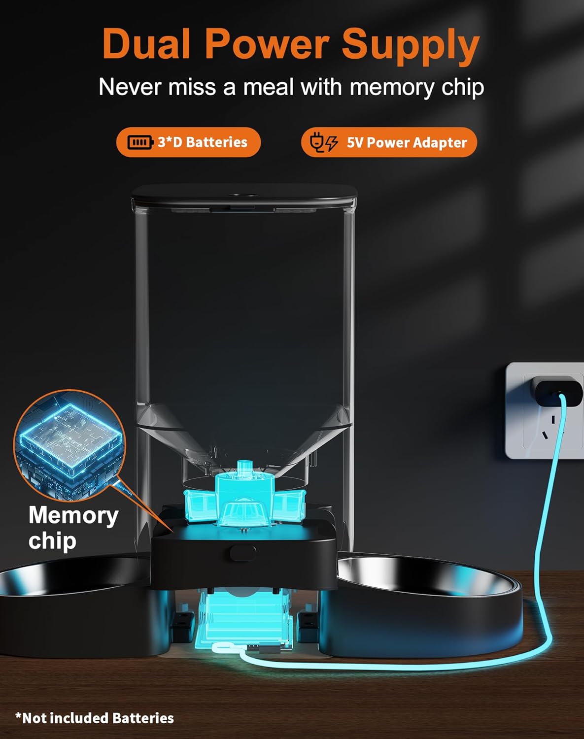 - 【Dual Power Supply】The feeder comes with a Type C adapter and has the option to use 3 D-cell batteries (not included), We recommend using both battery and adapter. The machine needs to be plugged in when used with wifi connection.In the event of a power outage, the automatic dog feeder will continue to run on 3 D-size batteries to ensure your pets never miss a meal.(Note:Cannot connect to wifi when using battery alone)