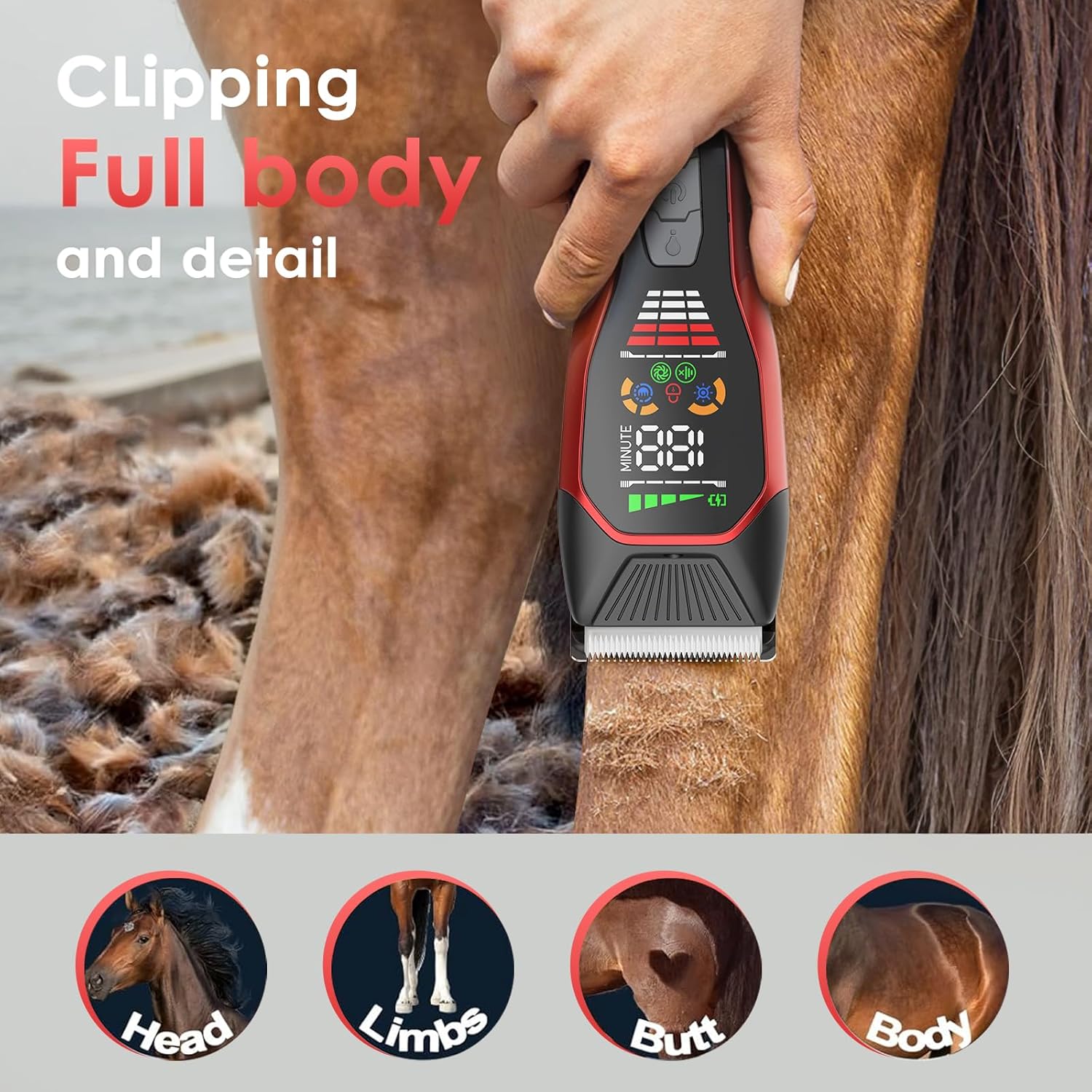 Horse Clippers,Quiet 2-Speed Horse Grooming Clippers,Rechargeable Pet Shaver with Scissors for Matted Long Hair,Cordless Wide-Blade Powerful Horse Trimmer Kit for Thick Coat #066 Red