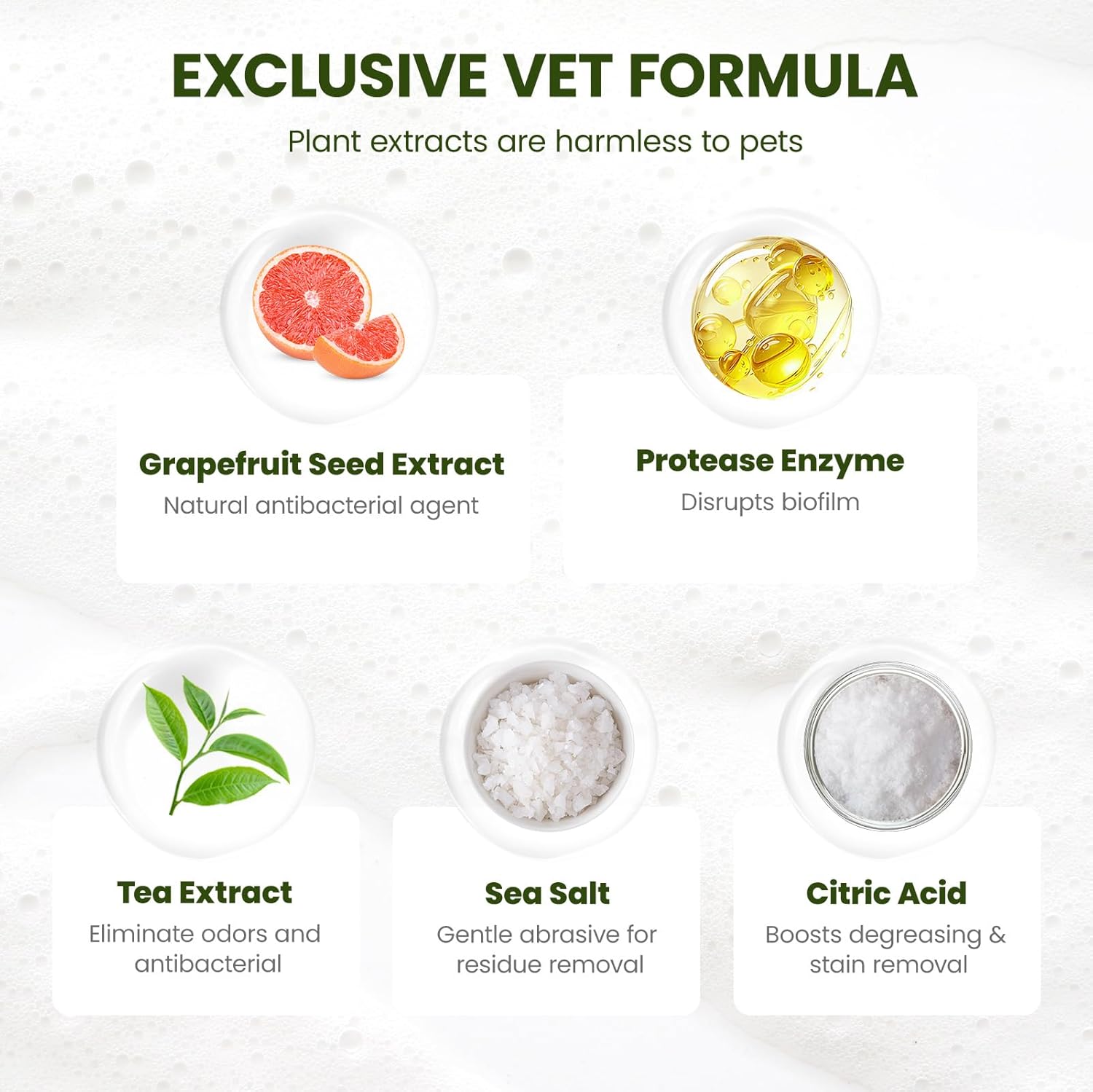 - Natural & Safe Ingredients: Vet-inspired formula with grapefruit seed extract (naturally derived purifier), tea polyphenols (odor control), sea salt (gentle scrub), and citric acid (degreasing), combined with protease to help break down residue films. Hypoallergenic and lick-safe—even for puppies and sensitive pets.