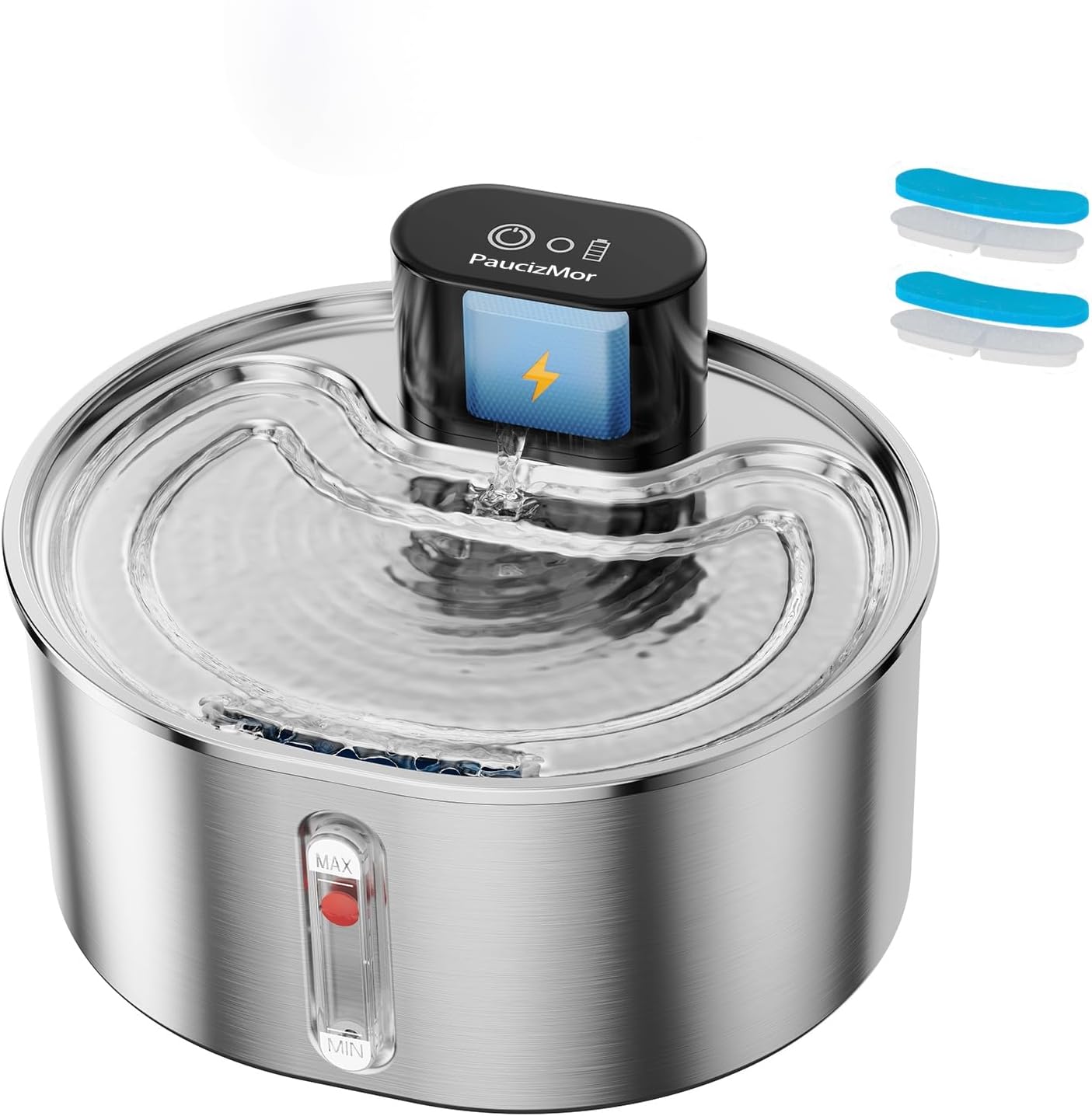 Pumpless Cat Water Fountain Stainless Steel Battery Operated, 108oz/3.2L Wireless Pet Water Fountain, Cordless Automatic Dispenser with 2 Replacement Filters for Cats, Dogs, Multiple Pets