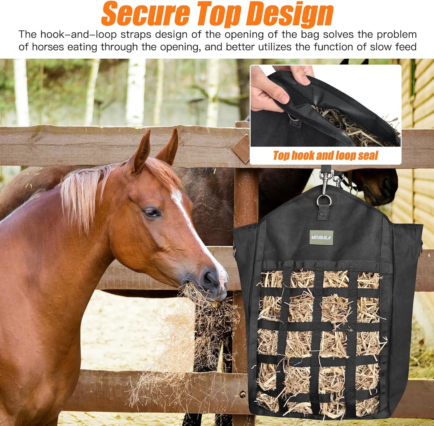 Hay Bags for Horses,Two-Sided Premium Oxford Slow Feed Hay Bags for Goats,Sheep,Donkey,Large Top Opening with Hook-and-Loop Seals,Easy to Hang with Adjustable Strap (Black, Large 2 Packs)
