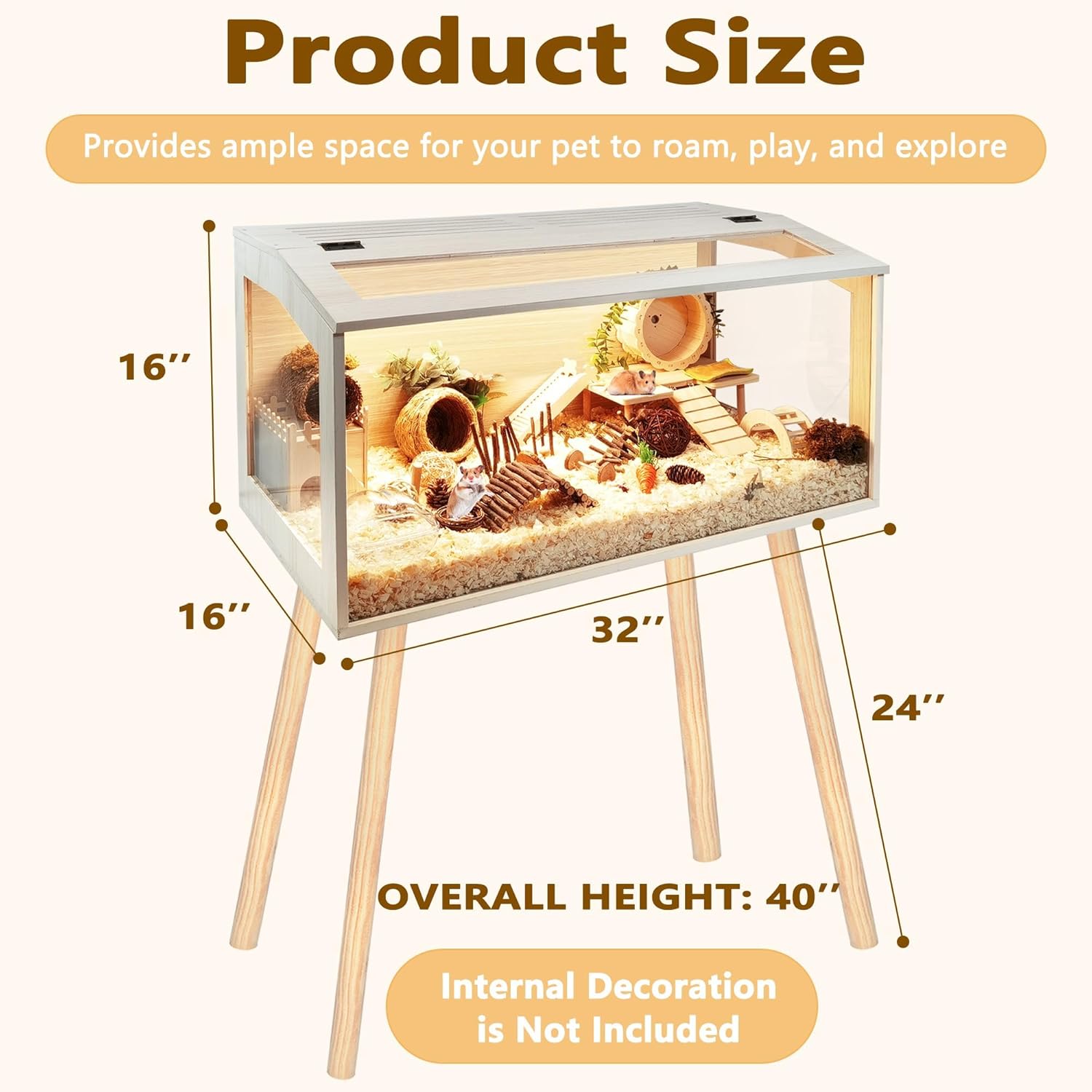 - 【High-Quality Materials】Available in 4 sizes ranging from 24 to 48 inches in length, with 24-27.5 inches legs height, please refer to picture 3 for size information. Crafted from durable, high-density natural wood treated with a rot-resistant, waterproof coating, our cage ensures longevity and aesthetic appeal. Transparent acrylic panels provide a clear view of your cherished hamsters' activities. An additional acrylic sheet on the cage bottom prevents moisture buildup, simplifying cleaning tasks.