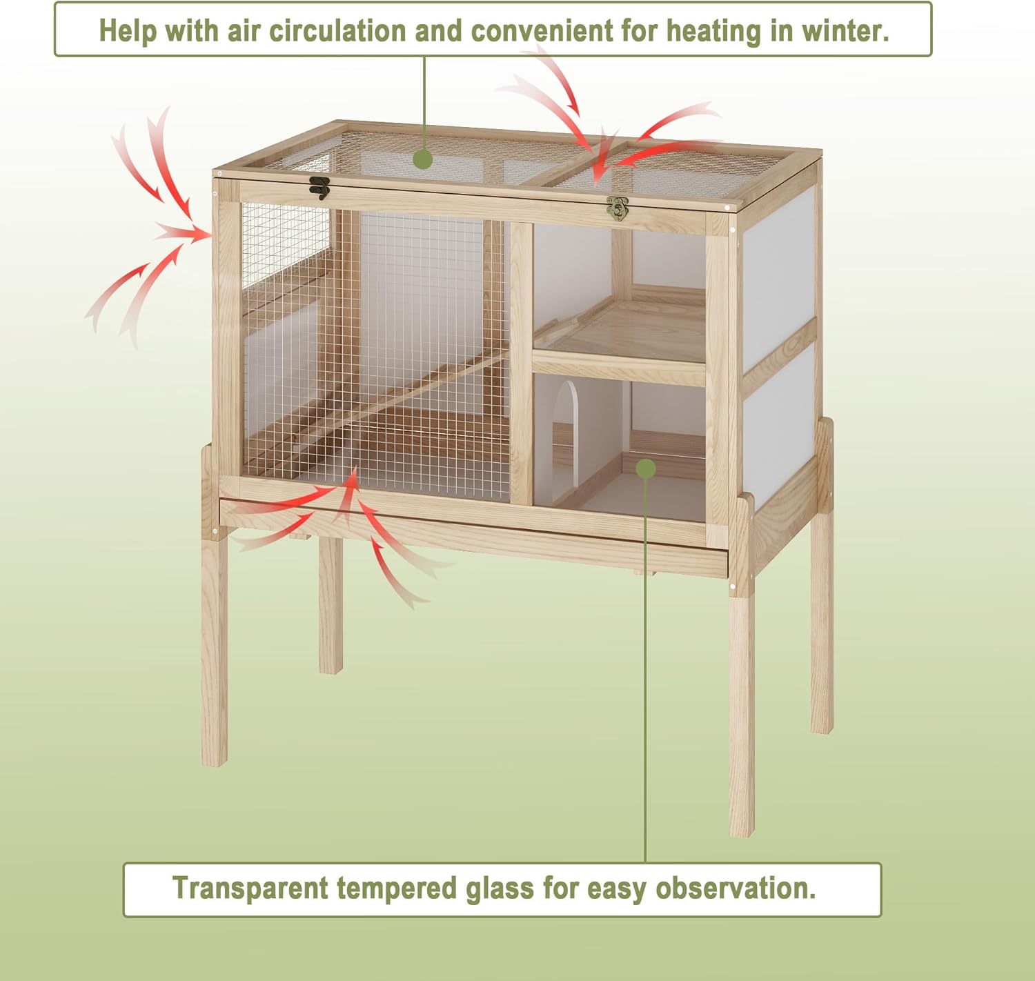 - High Quality: This solid fir animal cage features a sturdy structure with a smooth, paint-free, and burr-free surface, ensuring the safety and health of both you and your pets. The tempered glass allows you to observe animals easily at any time. The wire mesh on the top prevents mischievous animals from escaping and promotes good air circulation, creating an ideal living environment for them